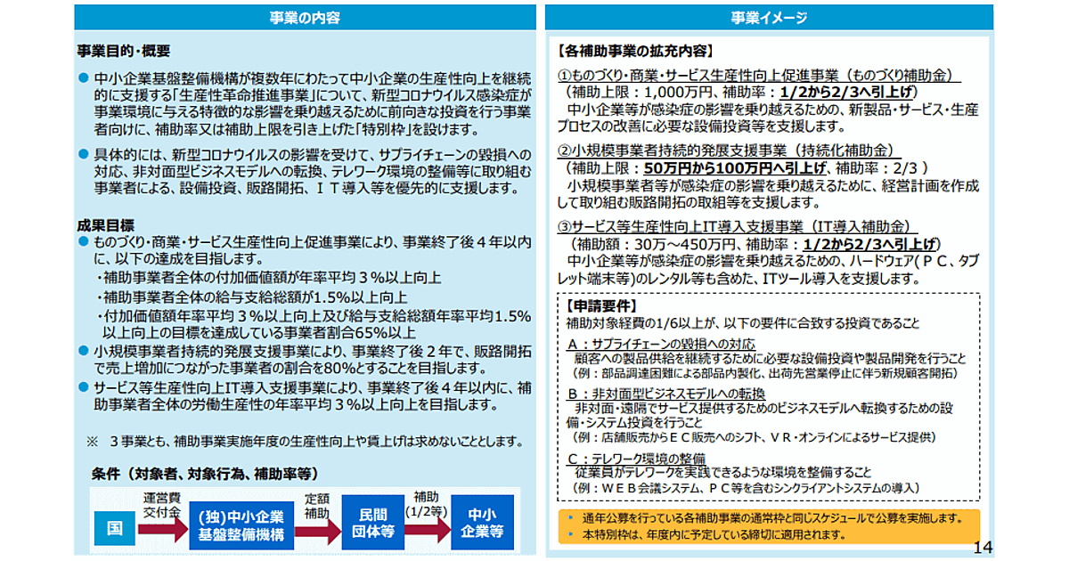 政府が閣議決定した経済産業省の2020年度補正予算案によると、IT導入や販路開拓支援などを行う中小企業生産性革命推進事業において、IT導入補助金の補助率を従来の1/2から2/3に引き上げ、持続化補助の補助金を100万円に引き上げるといった特別枠を創設する。