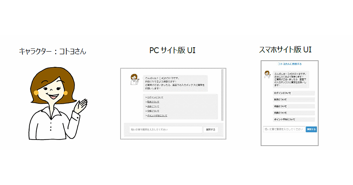 「配送料について」「ログインができなくなった」「ポイントの利用方法」など、仮想エージェントの「コトヨさん」が、顧客からの問い合わせに24時間365日対応する。
