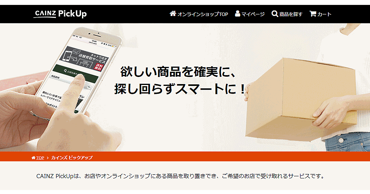 「取り置きサービス」は、カインズオンラインショップやカインズアプリで選んだ商品を取り置き、希望のカインズ店舗で商品が受け取れるサービス。当該店舗に在庫があれば、注文した当日中に商品を受け取ることが可能となる。