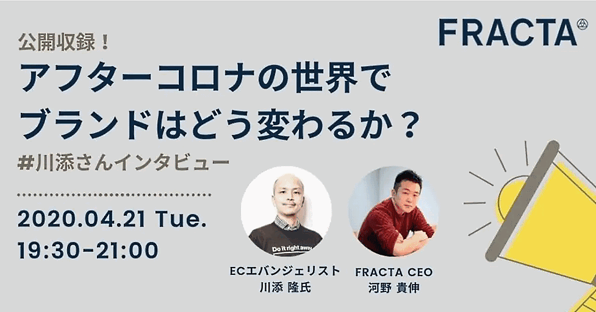 新型コロナウイルス感染下でビジネスを行うEC事業者などに向けて、ビジョナリーホールディングスの執行役員(デジタルエクスペリエンス事業本部本部長)でECエバンジェリストの川添隆氏に、フラクタの河野貴伸CEOが音声プラットフォームアプリ「stand.fm」を通じて公開インタビューを行う。