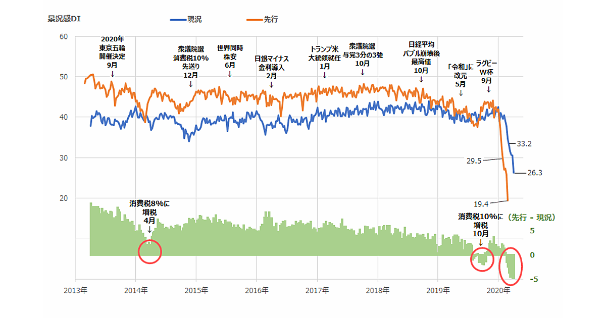 景況感(景気に対する印象)については、過去2度にわたる消費増税では「現況」「先行き」とも大きく低下。今回の新型コロナの感染拡大では、そのスコアを大きく下回った。経済の不透明さによる消費者心理への影響の大きさが、この低下率から読み取ることができる。