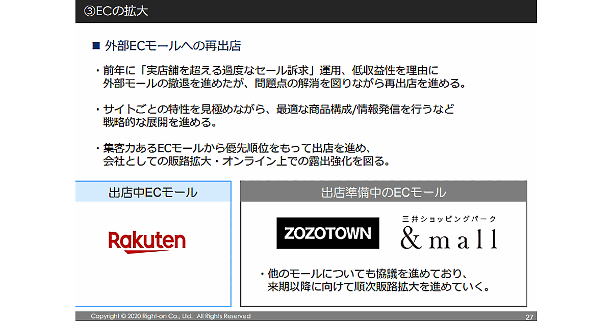 2019年3月に自社ECサイトをリニューアルし、直近は自社ECを成長戦略の中核と位置付けてきたが、EC事業を拡大するため、今後はECモールにおける問題点の解消を図りながら再出店を進めるという。