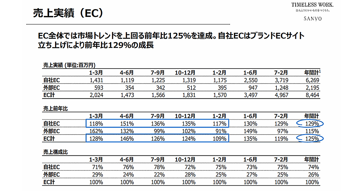 EC事業は重点的な投資や集客のためのプロモーションを実施したほか、在庫欠品率の改善が奏功し、計画以上の売上高を確保したとしている。