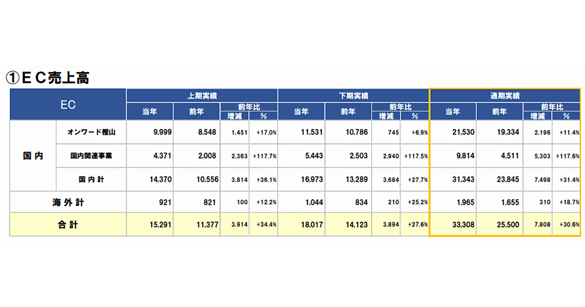 主力子会社のオンワード樫山のEC売上高が10%以上伸びたほか、他のグループ企業の国内EC売上高は2倍以上に増加。連結売上高に占めるECの割合(EC化率)は、前の期と比べて2.8ポイント増の13.4%に上昇している。