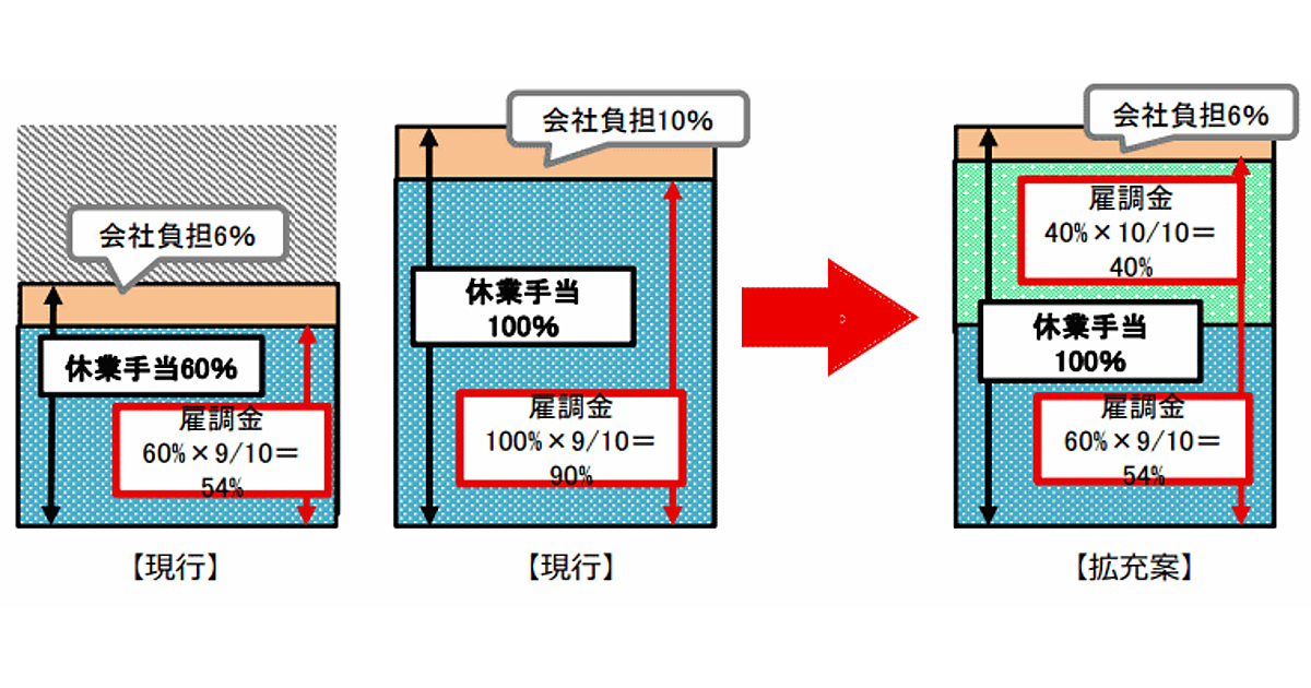 現行の新型コロナウイルス感染症特例措置では、助成率は中小企業で約67%(2/3)、大企業で50%だが、「緊急対応策」でそれらを中小企業は80%、大企業は約67%(2/3)に引き上た。また、1人も解雇しなかった場合は中小企業で90%、大企業で75%としている。