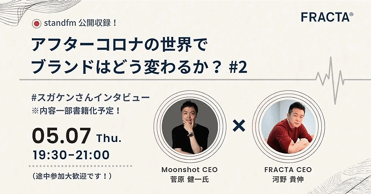 顧客の消費活動、デジタルシフトなどについて、フラクタの河野貴伸CEOが「stand.fm」を通じて菅原氏に公開インタビューを行う。