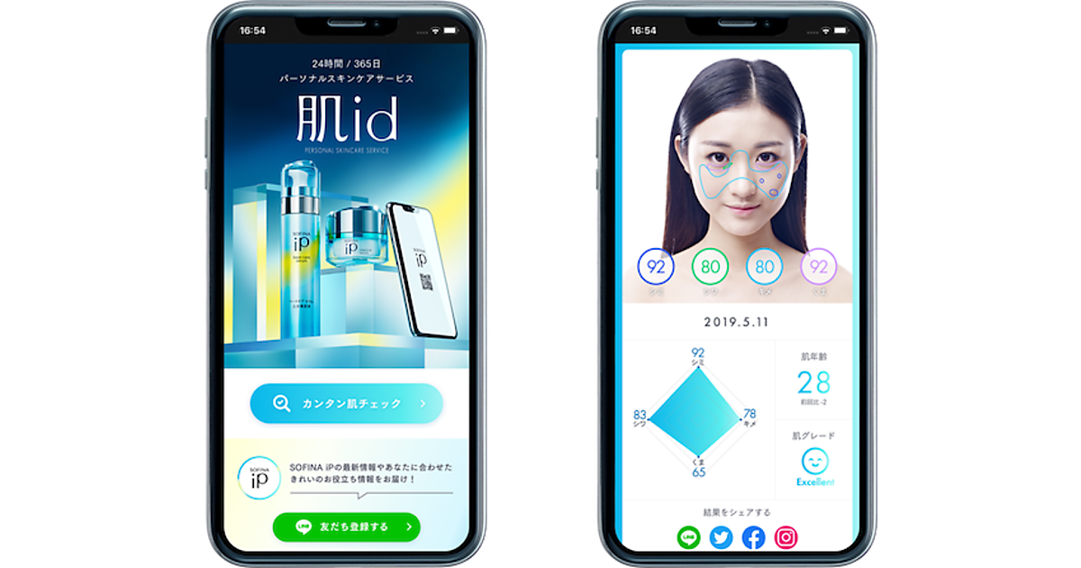 花王の人気スキンケアブランド「SOFINA iP」は2019年末、主力商品「ベースケア セラム(土台美容液)」のリニューアルに合わせ、パーソナルスキンケアサービス「肌id」の提供を開始した。シミ・シワなどの肌状態をAIが解析し、肌に合ったおすすめ商品を提案したり、1人ひとりに合わせた美容情報を届けるというもの。