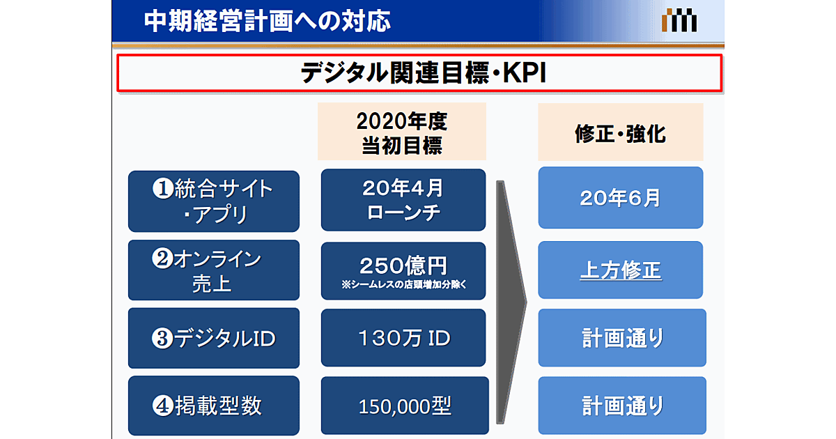 2020年度(2021年3月期)におけるオンライン売上高の計画は、当初は250億円に設定していたが、新たなデジタル施策を追加したことを踏まえて計画を上方修正する方針。中期経営計画の修正内容は2020年11月に公表する予定。