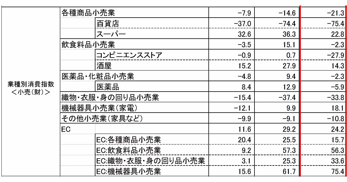 「EC:織物・衣服・身の回り品小売業」(同33.6%増)、「EC:飲食料品小売業」(同56.3%増)などの専門ECの伸びも目立ち、家電を含む「EC:機械器具小売」(同75.4%増)は4月前半(同36.7%増)から2倍近く増加している。