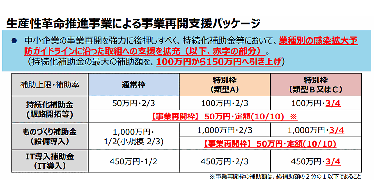 「ものづくり・商業・サービス生産性向上促進事業(ものづくり補助金)」の補助上限は1000万円だが、特別枠の場合は「事業再開枠」の上乗せが可能。「小規模事業者持続化補助金」は、コロナ特別対応型(補助上限を50万円から100万円へ引き上げ、補助率は2/3としている)の交付決定額を超えない範囲とする。