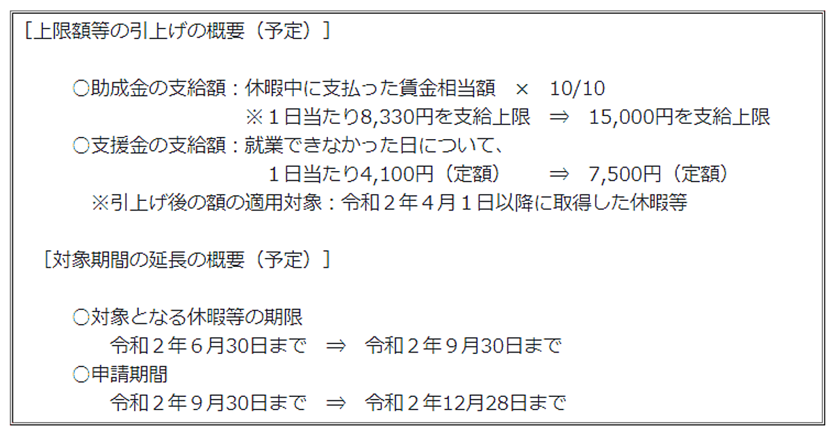 小学校などの臨時休業によって仕事を休まざるを得なくなった子どもを抱える労働者に対し、有給休暇を取得させた事業主へ助成を行う「小学校休業等対応助成金」の助成金額の上限を、従来の1日あたり8330円から1万5000円に引き上げる。