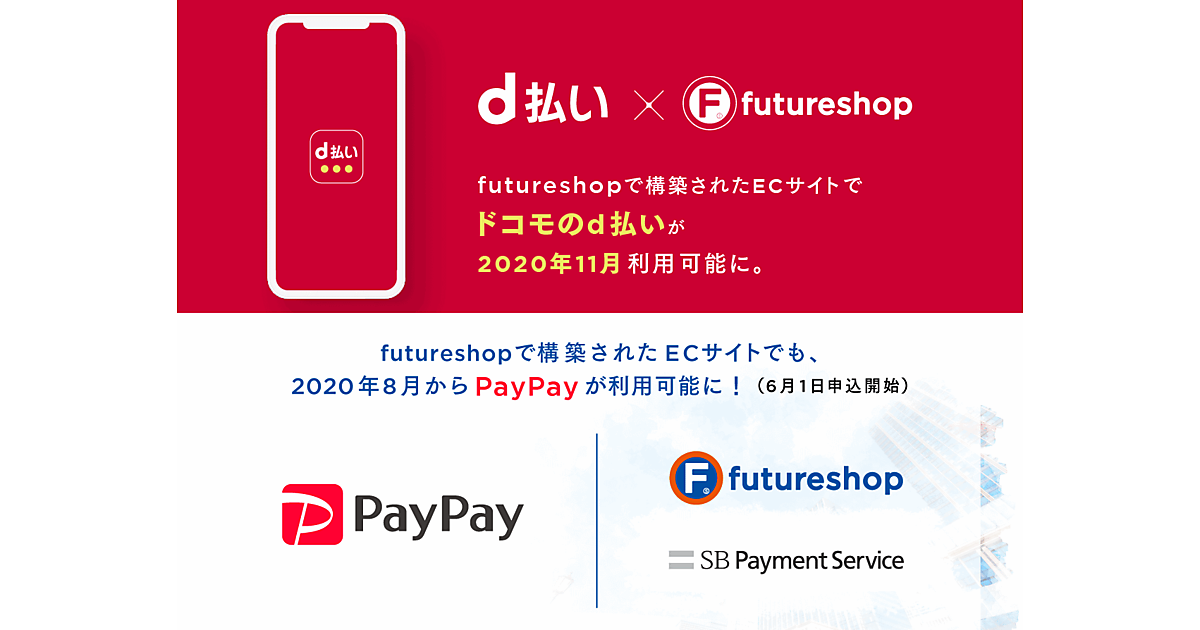 「PayPay(オンライン決済)」「d払い」ともに、「futureshop」を利用し、SBペイメントサービスのオンライン決済サービスを導入する必要がある。