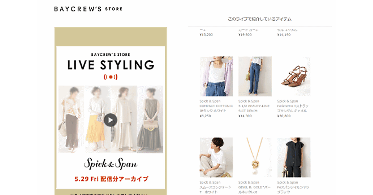ファッション通販サイト「BAYCREW'S STORE(ベイクルーズストア)」で、初の試みとなるライブコマース「LIVE STYLING」を5月22日から開始。5月29日には「spick&span」のアイテムによるライブコマースも始めた。
