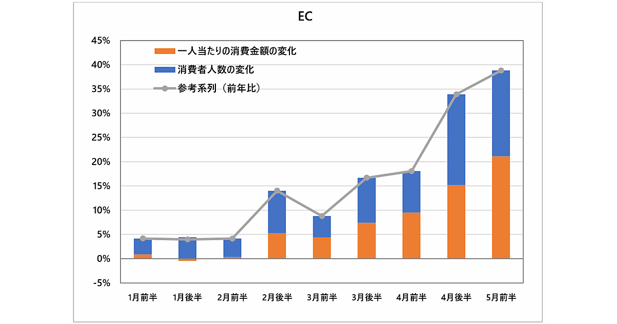 コロナ禍の消費動向で「EC」シフトが加速しており、前年5月前半との比較でECは21.1%増、1月後半との比較では33.5%増となっている