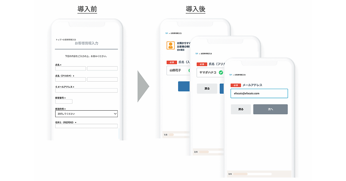 1画面の情報量を減らし、ユーザーは入力中の項目に集中できるようにすることで、確実に入力完了まで誘導する効果と、カゴ落ち改善効果が期待できるとしている。