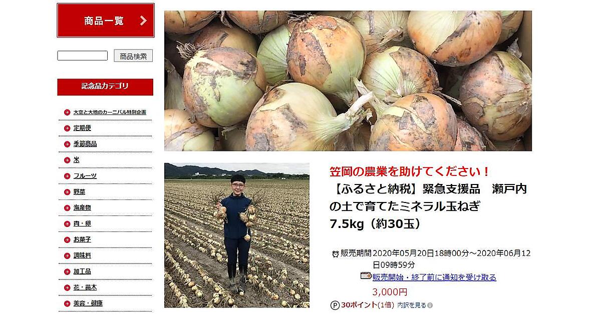 事態の確認から4日後となる5月21日。「笠岡産の新玉ねぎ」を返礼品として「楽天ふるさと納税」に掲載、受け付けをスタートした。