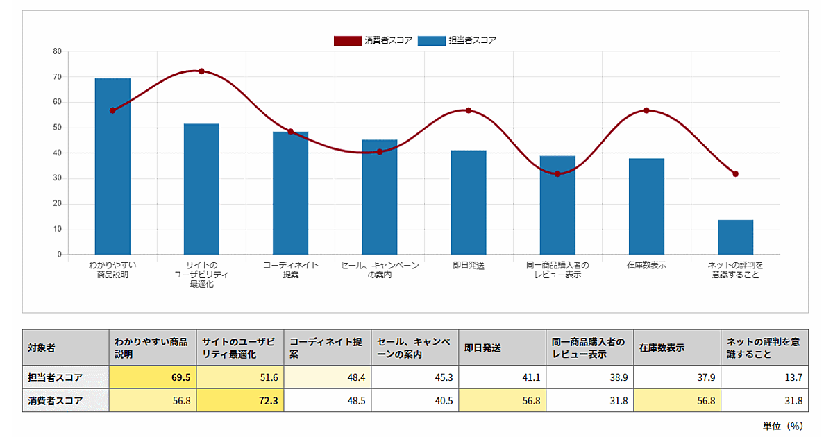 一方、企業のマーケティング担当者がECサイトの購買促進で注力しているのは、「分かりやすい商品説明」がトップで全体の7割を占めた。「サイトのユーザビリティ」「コーディネイト提案」は5割前後が注力している。