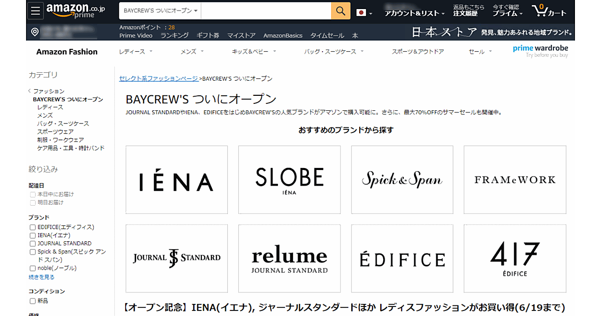 ベイクルーズグループは6月15日から、「JOURNAL STANDARD」などグループで手がける19ブランドの「Amazon.co.jp」での販売を始めた。