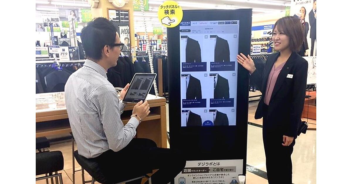 青山商事のECサイトは店舗在庫と連動しており、「デジタル・ラボ」の導入店は「洋服の青山」全795店舗の在庫確認が可能。2016年の秋葉原電気街口店(東京)を皮切りに、これまで主に都市部の狭小店(売り場面積100坪未満)の店舗に導入している。