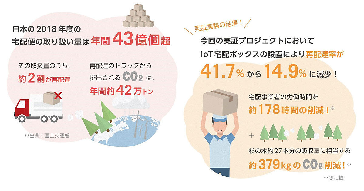 IoT宅配ボックスの設置で再配達率は、プロジェクト開始前の41.7%から設置後は14.9%に減少。宅配事業者の労働時間は約178時間削減した。また、約379キログラムのCO2削減にもつながった。宅配便1個の配達に掛かる作業時間は約0.22時間、再配達1個あたりの排出CO2は0.47キログラムで算出している。