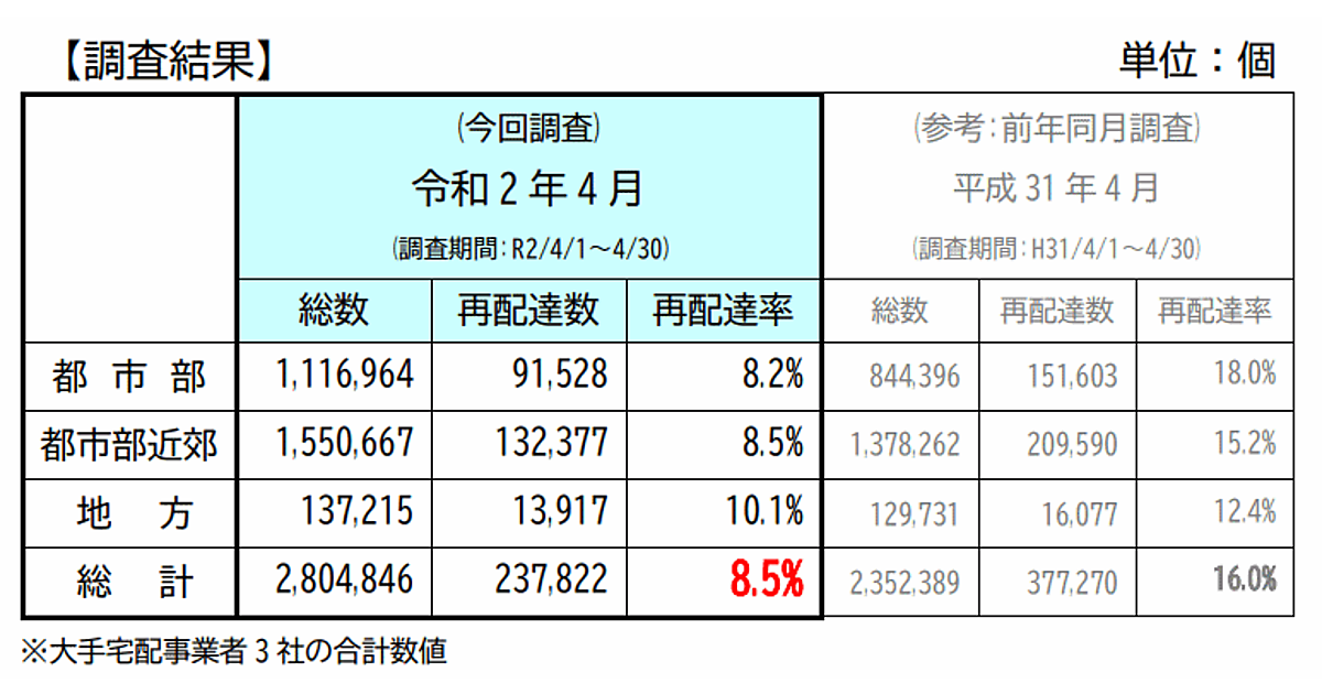 2020年4月の宅配便再配達率は約8.5%となり、調査開始以来最も低い数値となった。今回の調査結果は前年同月と比べて約7.5%ポイント減