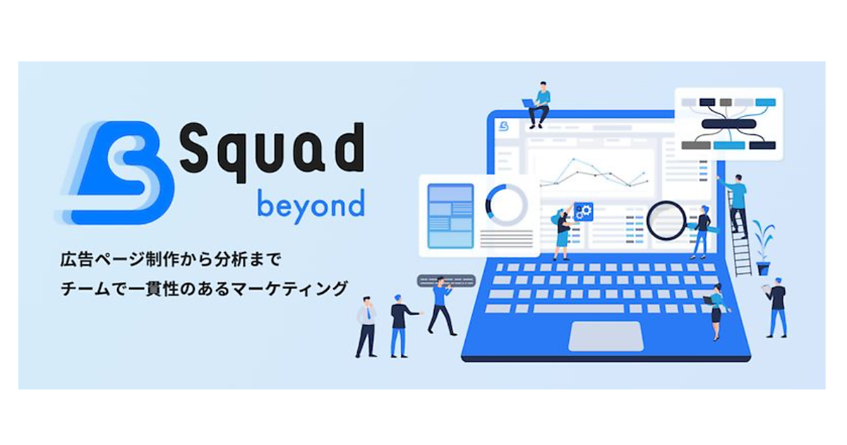 「Squad beyond」は、デジタルマーケティングに必要なランディングページ(LP)作成・広告運用・解析・最適化・レポート作成などの機能を搭載したデジタルマーケティングプラットフォーム。同一プラットフォーム内で広告提供側に必要なすべての作業を完結できる。