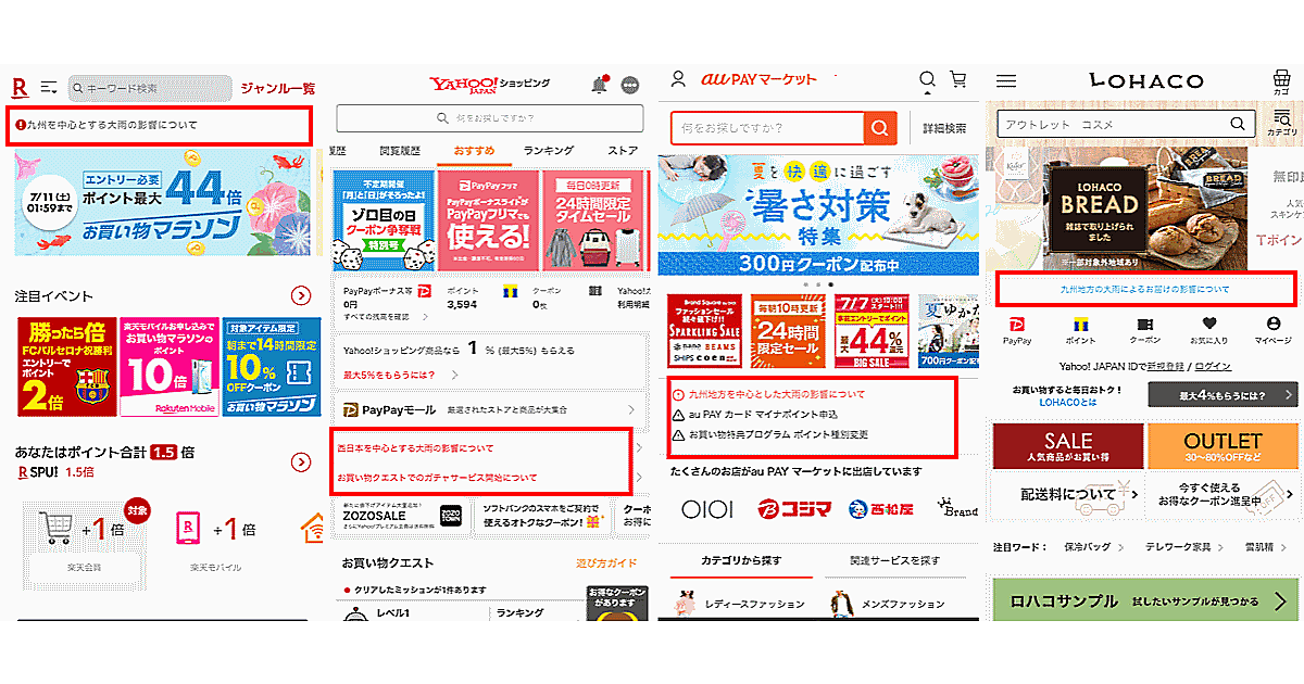 こうした状況下、EC企業に求められるのがECサイト上での「配送遅延の可能性」の掲出。「楽天市場」「Yahoo!ショッピング」「Wowma!」などのECモールでは7月6日までに、トップページなどで配送状況に関するお知らせを掲示。「ロハコ」などのECサイトでも、大雨の影響による配送遅延状況を掲示する動きが出ている。