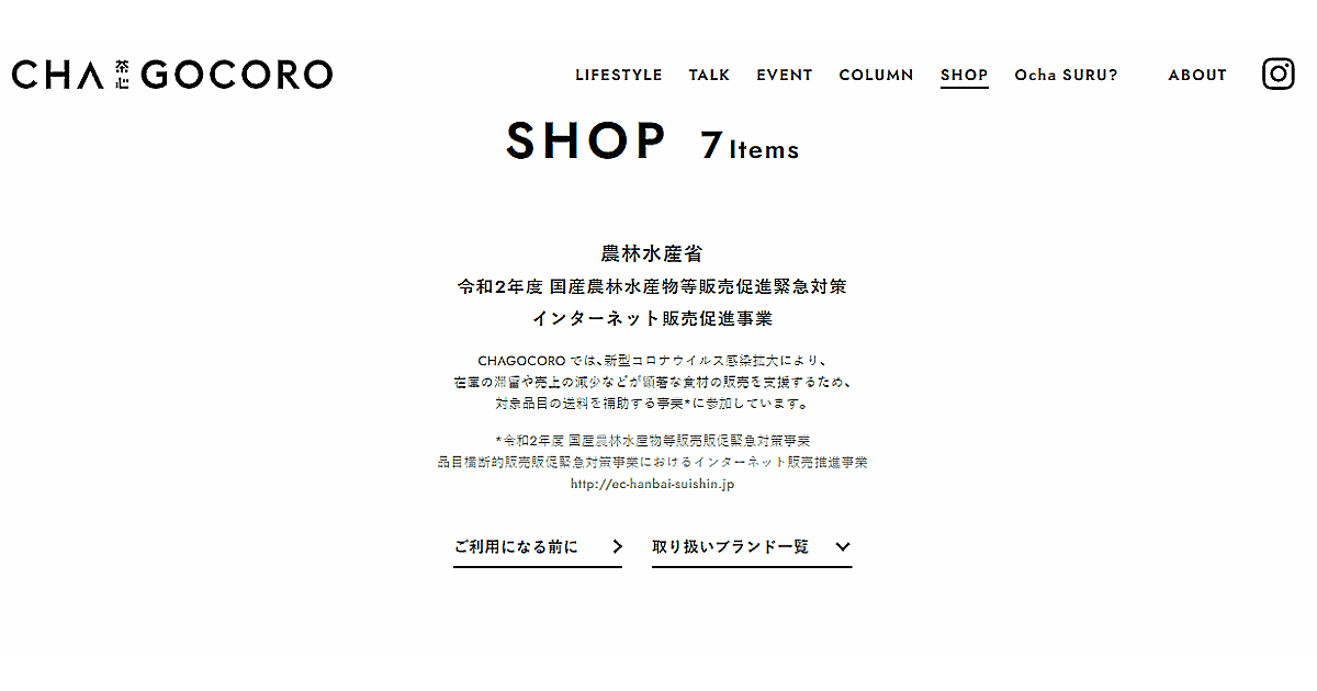 日本では近年、生産者の高齢化等を背景に、茶農家や茶栽培面積などの減少に加え、新型コロナウイルス感染拡大が直撃。こうした生産者を支援するため、在庫滞留や売上減少などが顕著な食材の販売促進支援を目的とした、農水指定の対象品目の送料を補助する事業に参画。自社で運営するサイト「CHAGOCORO(チャゴコロ)」内に、新しく通販ページを立ち上げる。