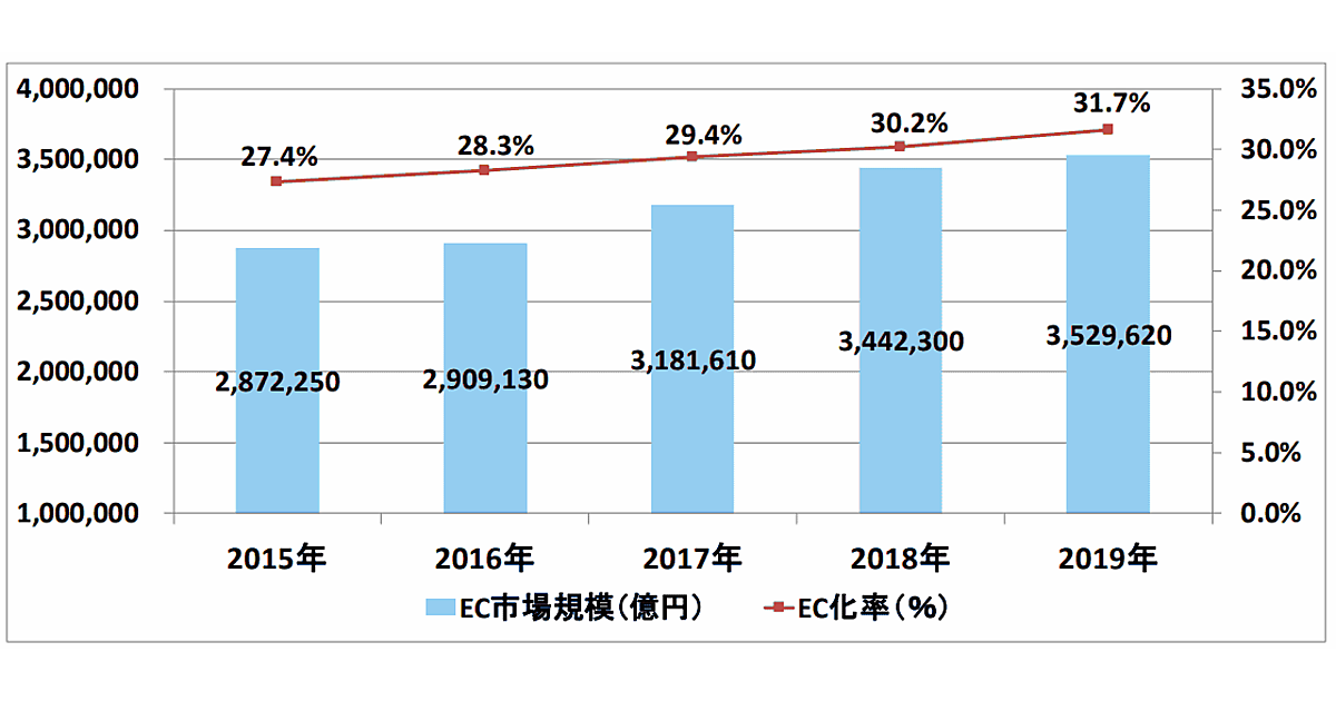 小売りなどの「その他」を除いたEC化率は、2018年比で1.5ポイント増の31.7%。