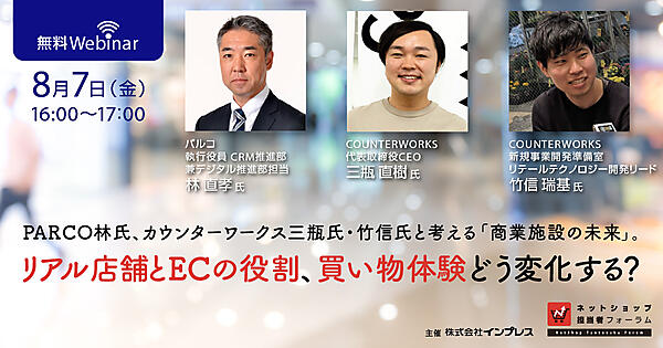 コロナ禍で消費行動はどのように変化しているのか。小売・ECに関するデータからは、緊急事態宣言を受けた自粛要請などでECの利用が広まる一方、ECだけでは満たされない消費行動が浮き彫りになっている。緊急事態宣言前後の消費行動から改めて実店舗の価値・課題に向き合い、どのようにECとリアル店舗を共存させたらいいのか。商業施設や店舗の運営改善をサポートするデータプラットフォーム「adptOS」の開発、ポップアップストアの出店支援などを行うカウンターワークスの竹信瑞基氏が、さまざまなデータを元に小売業界の考察を行う。