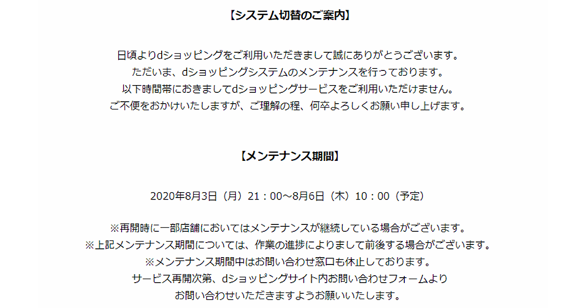 システムメンテナンスのために8月3日21時から運営を停止しているECモール「dショッピング」が、8月6日(木)10時に再開する見通しとなった。