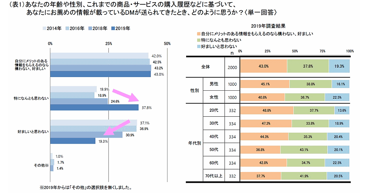 年齢や性別、商品やサービスの購入履歴などに基づいて、お薦め情報が載っているDMが送られてきたときにどのように思うか聞いたところ、「好ましいと思わない」と回答したのは、前回調査(2018年)から11.6ポイント減の19.3%。パーソナライズDMは受容される傾向となっていると言える。