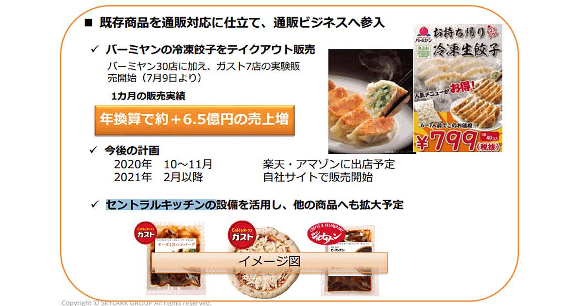 現在、テイクアウト販売しているバーミヤンの看板商品「冷凍餃子」など、既存商品を通販・EC用に仕立てて販売する。全国10か所に構える食材管理と調理を行うセントラルキッチンの設備を活用し、バーミヤン以外の業態の商品も展開する。