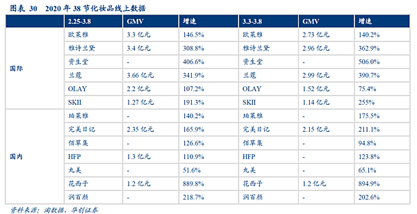 オンラインでの購買習慣が根付いた結果、ECの販売額は伸びてきている。3月8日は中国で“婦人の日”とされ、成人女性向けの商品が売れる日だが、華創証券の証券レポートによると、オンライン高級化粧品売上が前年比で爆増する結果となった。セール期間が延長されたという背景もあるが、例えば日系の資生堂は取引総額(GMV)を開示していないがグローバルブランドトップの伸び率(前年比)をたたき出した。