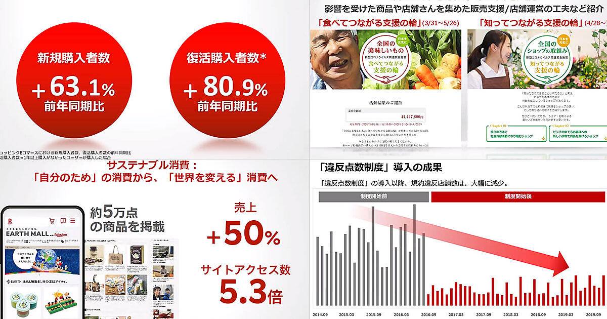 SDGsの環境、社会、経済の3つの側面に貢献する商品やサービスを紹介する「EARTH MALL with Rakuten」も急激に伸びており、売り上げは前年同期比50%増、サイトアクセス数は5.3倍になった。
