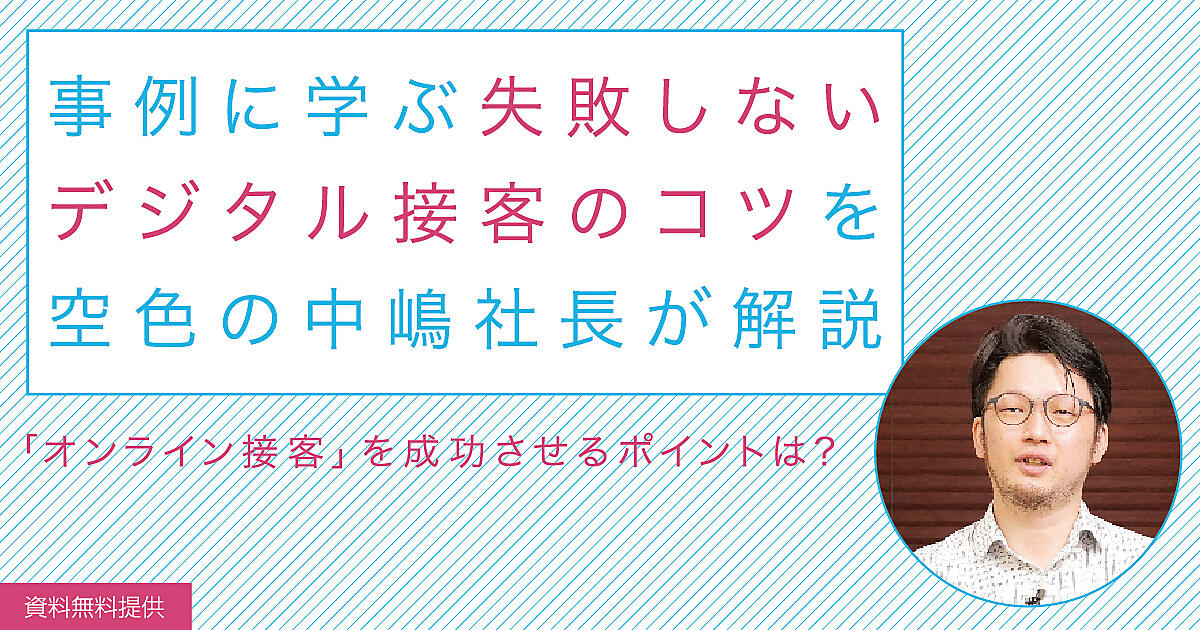本書では、オンライン接客のソリューションを提供する空色の中嶋洋巳社長が、自身の知見、サービス提供を通じた事例などをもとに、「オンライン接客の失敗例」「成功事例」「成功ポイント」などを解説。これから導入を検討する企業はもちろん、すでにオンライン接客を導入している企業にも役立つ資料としてまとめている。