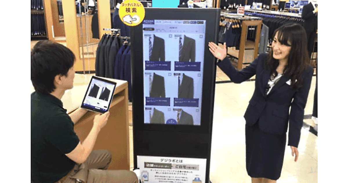 「デジタル・ラボ」は、ネットの豊富な在庫数とリアル店舗の接客サービスの両メリットを最大限に生かしたシステム。導入店の店内には、青山商事のEC サイトと連動するタッチパネル式の大型サイネージやタブレット端末を複数設置し、来店客はこれらの端末を通してECサイト上にある約1000万点以上の在庫から好みの商品を選ぶことができる。