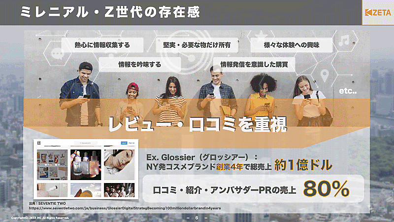 山崎社長が「重要な要素でかつ見落としてはいけない」と強調したのが「ミレニアル・Z世代の存在感」だ。インターネットやパソコンなどがある生活環境で育ってきたデジタルネイティブ世代の視点として、「レビューやクチコミを重視している」ことを押さえるべきと山崎社長は言う。