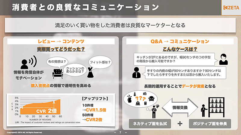 この消費行動でカギとなるのがレビューとQ&Aだ。「これから商品を購入しようとするお客さまと、既に購入しているお客さまが双方向で交われる場」(山崎社長)がレビュー機能。レビューを消費者の購入体験を向上させるための「コンテンツ」として捉えることが重要という。