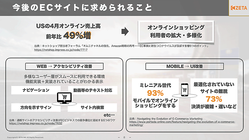 実店舗のOMO、Q&Aの精度やサイト内検索・レビューなどのコミュニケーション、そして、消費者に納得して商品を購入してもらうことで顧客体験の向上につなげていくCROをフォーカスすべきポイントとしてあげたのは、今後、モバイルを中心としたサイト・機能の整備が重要になるためだ。