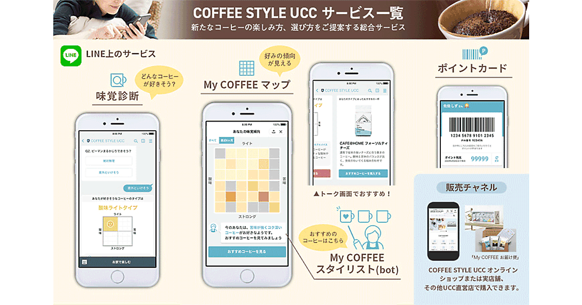 「My COFFEE STYLE」は、新たに追加した3機能のほか、「COFFEE STYLE UCCオンラインショップ」とUCC直営店舗の2つの販売チャネルで構成。ECサイトでは、サブスクリプション(定期購買)サービス「My COFFEE お届け便」もう申し込みができ、店舗で貯めたポイントも利用できる。