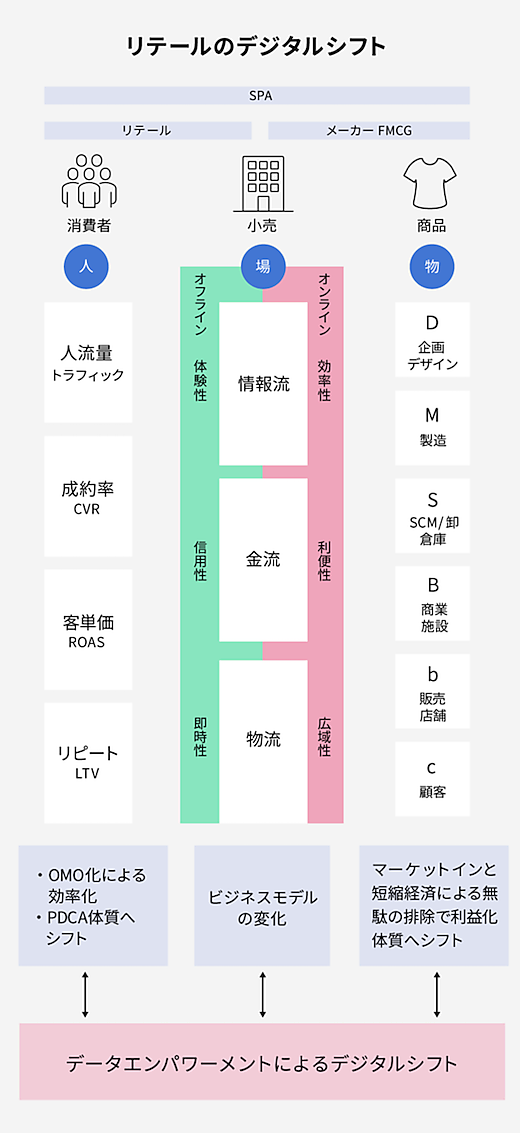 「物」には「短絡経済」のロジックで中間プロセスを変えて価格や利益を最適化する事、「人」には「売場効率革命」のロジックで売上高 =トラフィック(人流量 )×コンバージョン率 (成約率)×客単価×リピート率を上げる事、そして「場」には「データエンパワーメント」のロジックでオンラインとオフラインを有効活用し、「情報流」「金流」「物流」を効率化するという役割があります。