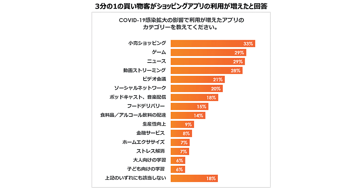 Criteo(クリテオ)が9月23日に公表した、新型コロナウイルス感染症の拡大によって変化したモバイルアプリの利用状況に関する調査レポートによると、回答者の3分の1が自粛期間中、ショッピングアプリの利用が「増えた」と回答している。
