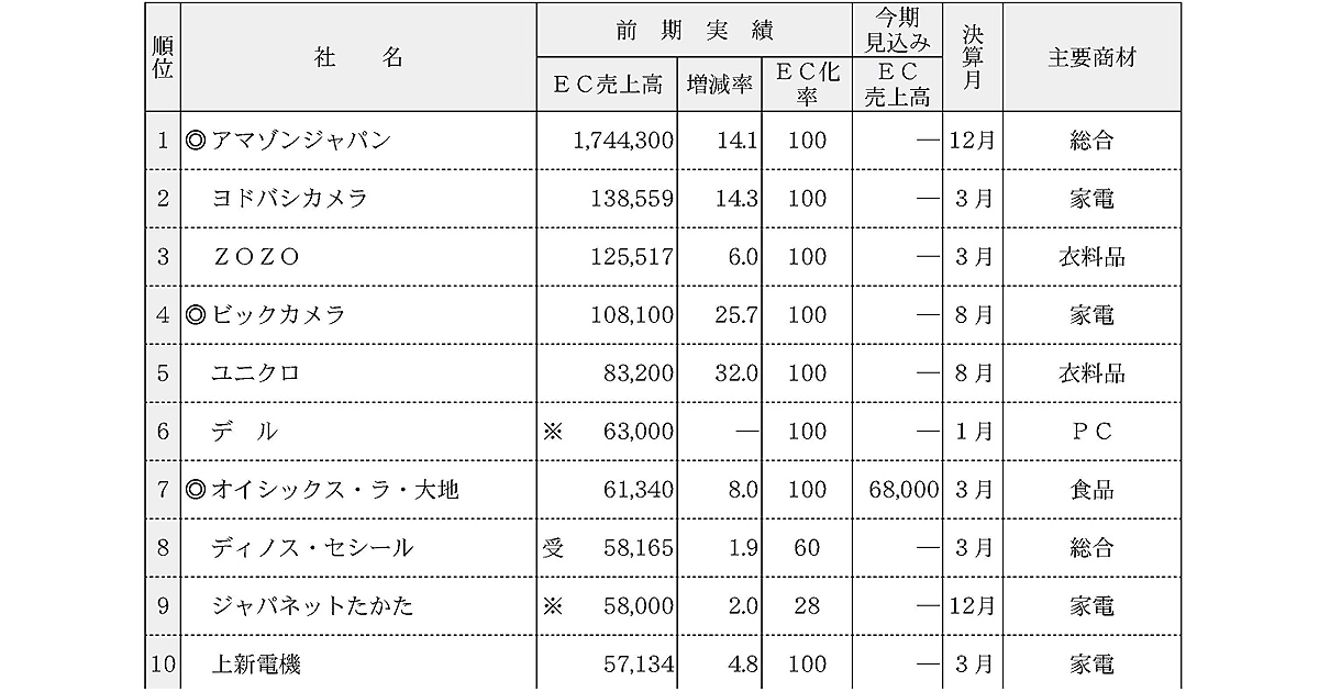 上位3社は前年と同じくアマゾンジャパン、ヨドバシカメラ、ZOZO