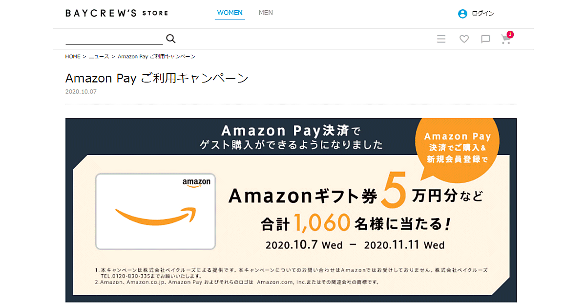 「Amazon Pay」導入を記念し、11月11日までキャンペーンを実施する。Amazonギフト券5万円分などが計1060人に当たる企画。ゲスト購入で5000円以上、「ベイクルーズストア」へ会員登録すれば応募できる。