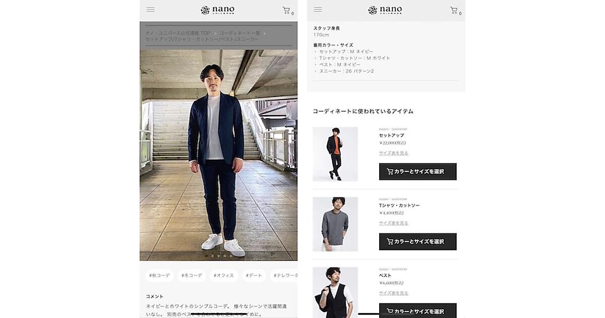 従来は、モデルが着用している商品画像と、店舗のスタッフが商品を使ってコーディネートを提案するスタッフコーディネートがそれぞれ別のエリアに表示されていたが、ナノ・ユニバースのECサイトではこれら2つを区別せず、一覧で表示される。コーディネートを表示する、しないの選択も可能。