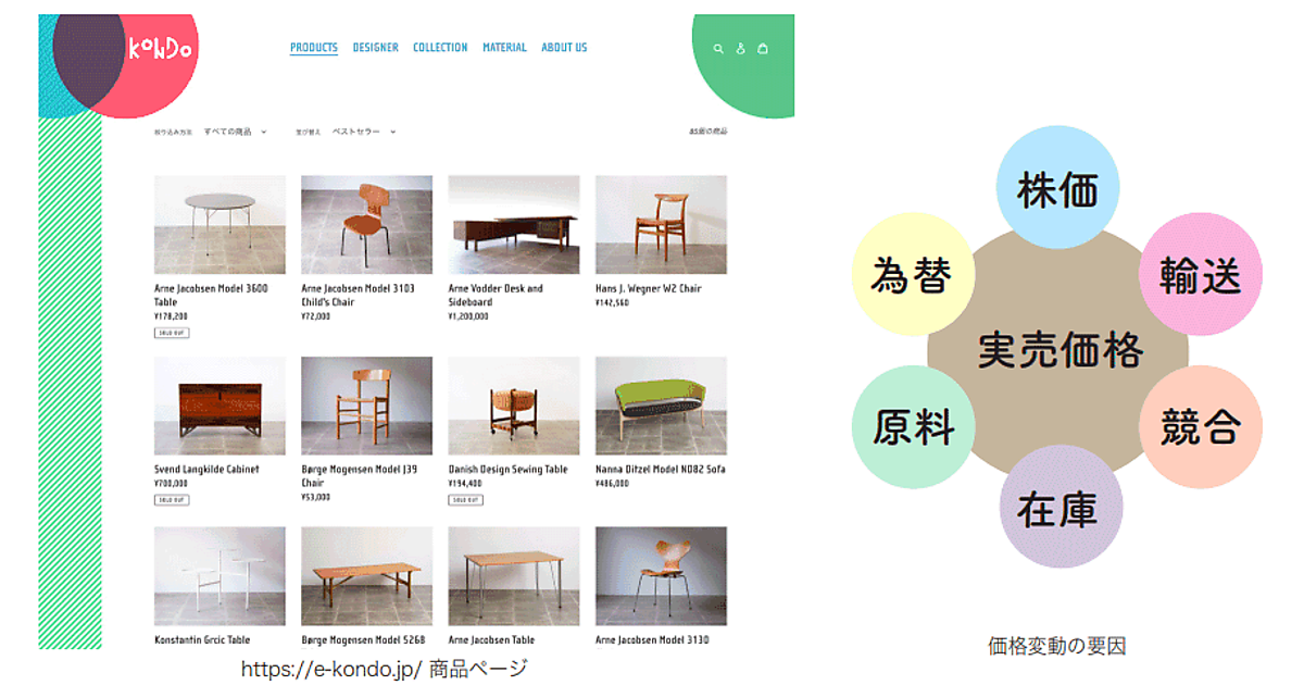 ダイナミックプライシングは通常、価格を消費者の需要と供給の状況に合わせて変動させるが、「KONDO」では家具に関する株価や為替、商品原料の希少性、輸送費の変動、競合他社の価格、ヴィンテージ品の現存数など独自の指標を数値化し、その変動に基づき実売価格を提示する。