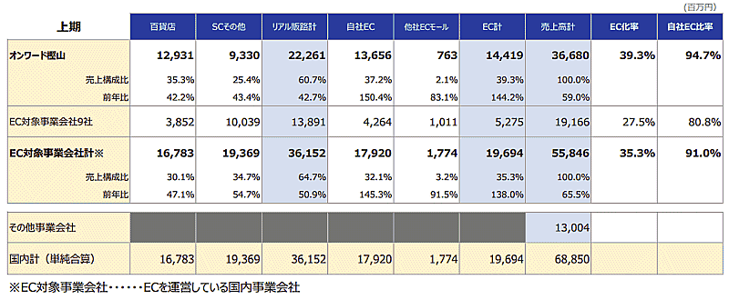 オンワード樫山単体で見ると、中間期売上高の構成比はECが39%、百貨店が35%、ショッピングセンターその他が25%と、初めてECが百貨店を上回った。