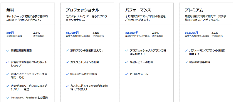 解約手数料がなく月額利用料や初期費用が無料のプランは決済手数料3.6%。売り上げは最短翌日入金で、振込手数料も不要。高度な機能を希望する事業者には、必要な機能に応じて3つの有料プランを用意している。