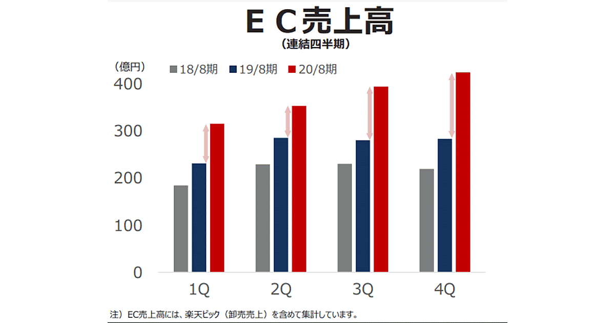2021年8月期のグループEC売上高は1割程度の増収を見込む。上期は新型コロナウイルス感染症拡大の影響で需要が伸びると予想しているが、下期はその需要が一巡すると見ている。